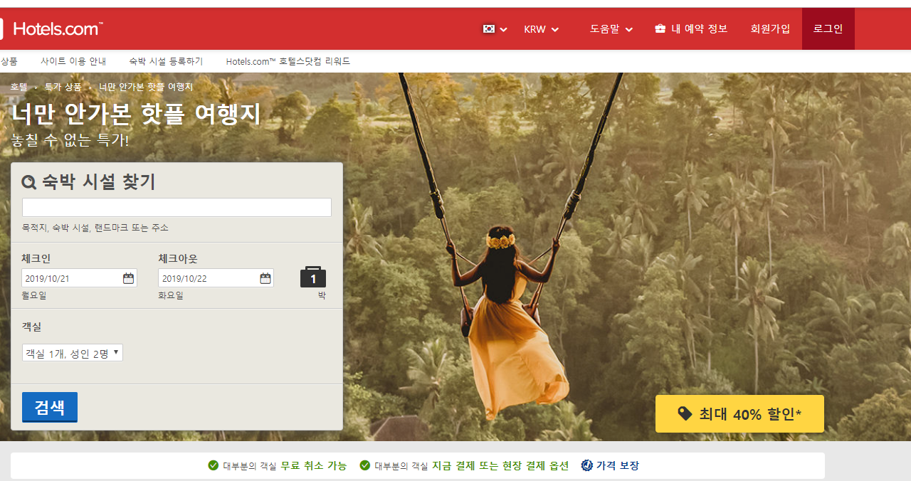 Hotels.com의 서비스를 통해 개별 운영 호텔, 유명 체인 호텔을 비롯한 전 세계 수십만 개의 다양한 숙박 시설을 예약하실 수 있습니다. 호텔 요금, 편의 시설 및 예약 가능 여부에 대한 원스톱 쇼핑 정보를 제공하며, 특히 성수기에도 고객님이 원하는 숙박 시설을 예약하실 수 있도록 도와드립니다.