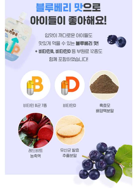 - 새콤달콤한 블루베리맛으로 입맛 까다로운 아이들도 맛있게 먹을 수 있어요.