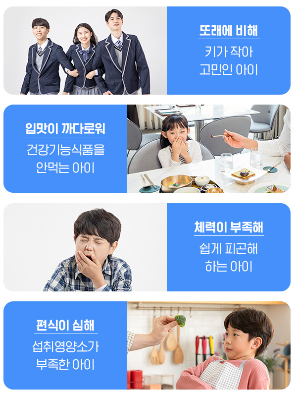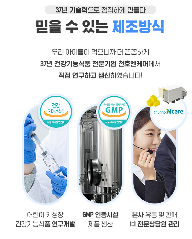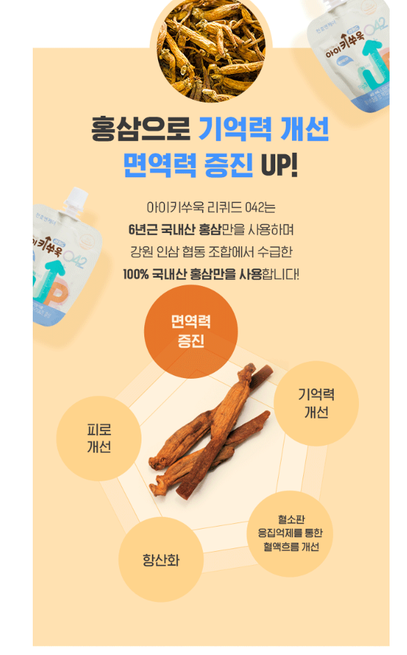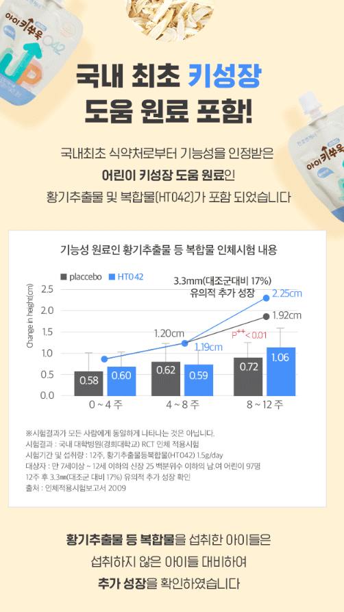 - 국내 최초로 식약처에서 어린이 키성장 기능성을 인정한 원료 황기추출물등 복합물(HT042)과 면역력 증진에 도움을 줄 수 있는 홍삼을 주원료로 하여 키성장과 튼튼한 체력을 동시에 챙길 수 있는 프리미엄 어린이 키성장 건강기능식품이 있더라구요.