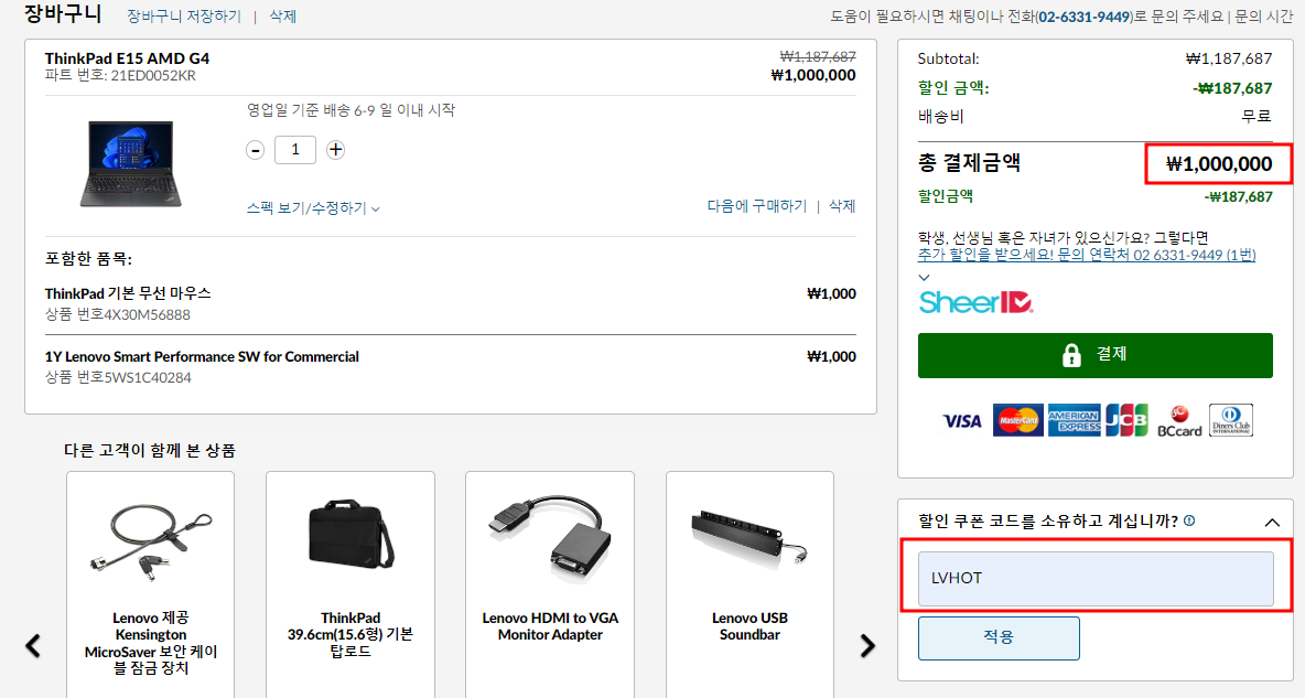 오른쪽 중간에 할인 쿠폰 코드를 입력하는 칸이 있는데