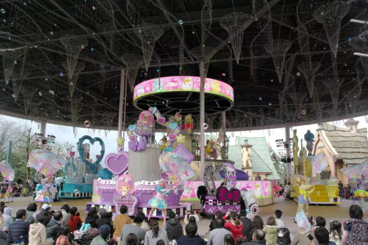 규슈의 산리오 하모니 파크는 언덕에 위치하고 있으며 귀엽고 재미있는 놀이기구가 다양합니다.
