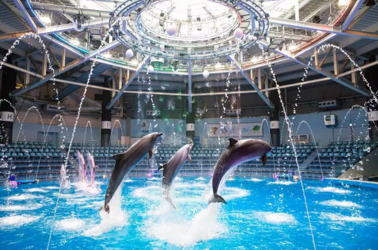 화려한 음향 효과와 원형 무대 디자인으로 돌고래 쇼를 360도로 감상할 수 있습니다.