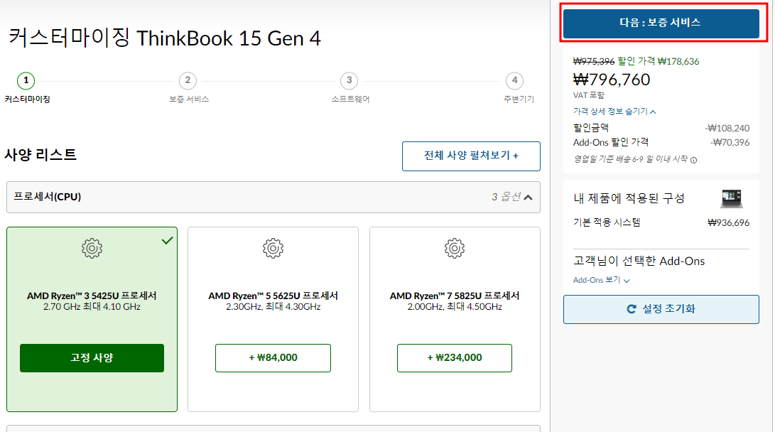 다음 화면에서 사양을 커스터마이징 할 수가 있어요.
