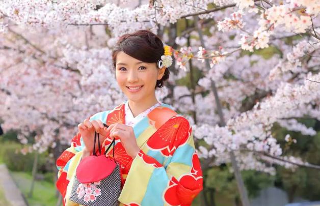 멋진 기모노를 입고 벚나무 아래를 산책 하세요.