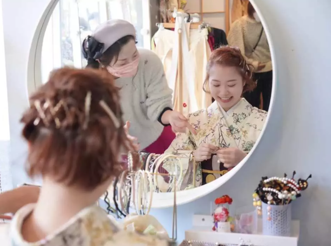 ※ 렌탈 기모노(여름에는 유카타 가능), 허리띠, 일본식 주머니, 게타, 옷차림을 도와주는 직원, 허리 장신구