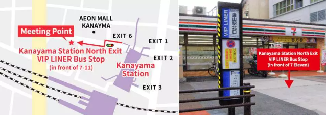 - 8:30am: 가나야마역(북쪽 출구) VIP 라이너 버스 정류장