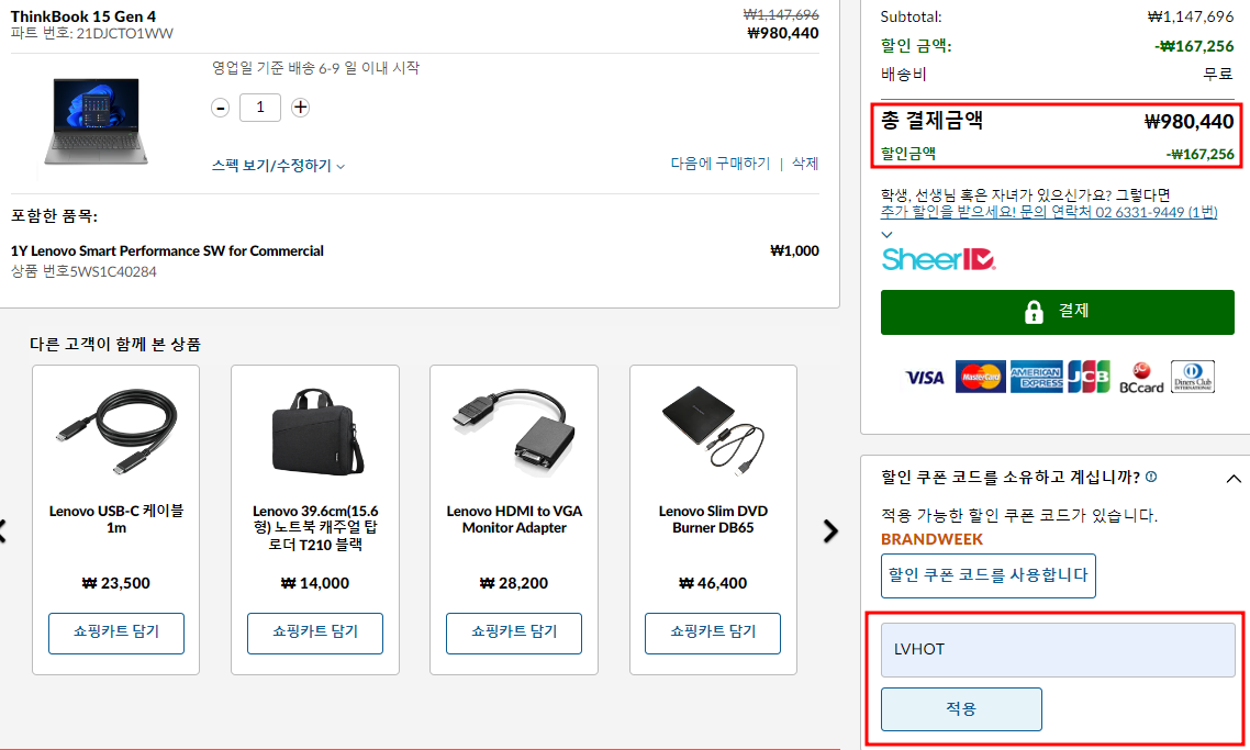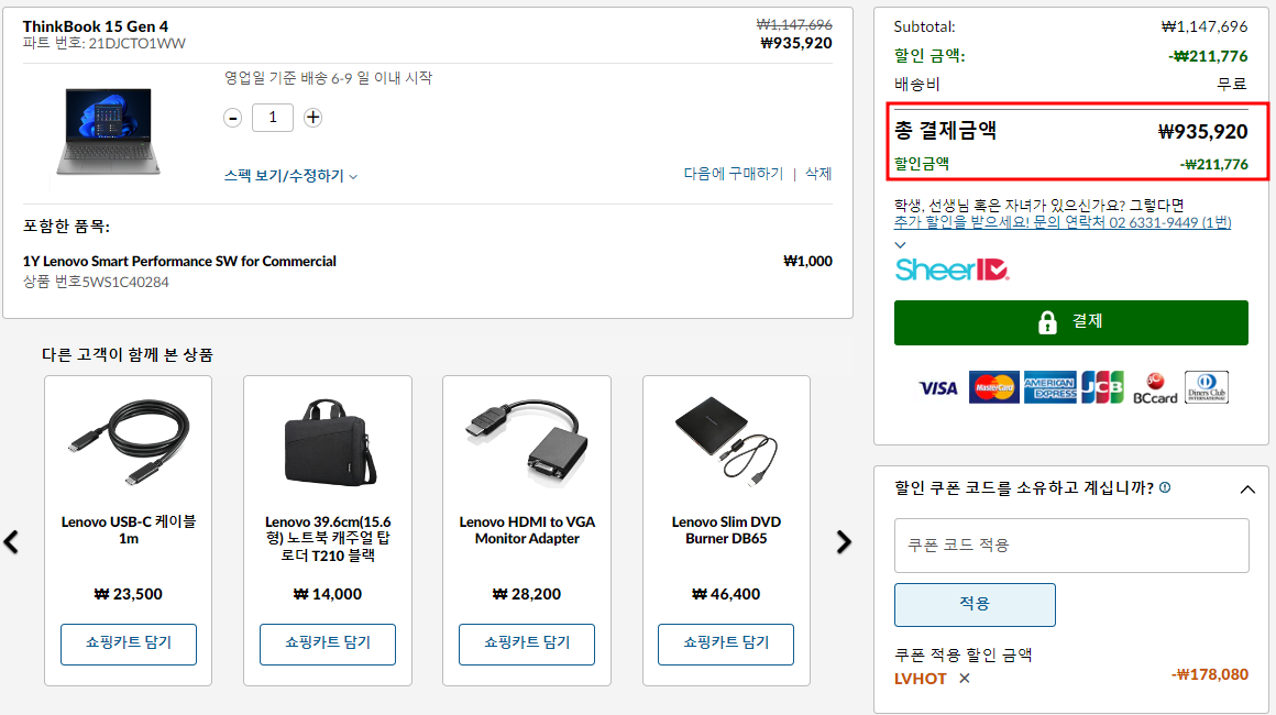 그럼 레노버 자체 할인코드보다 더 많은 할인이 된 것을