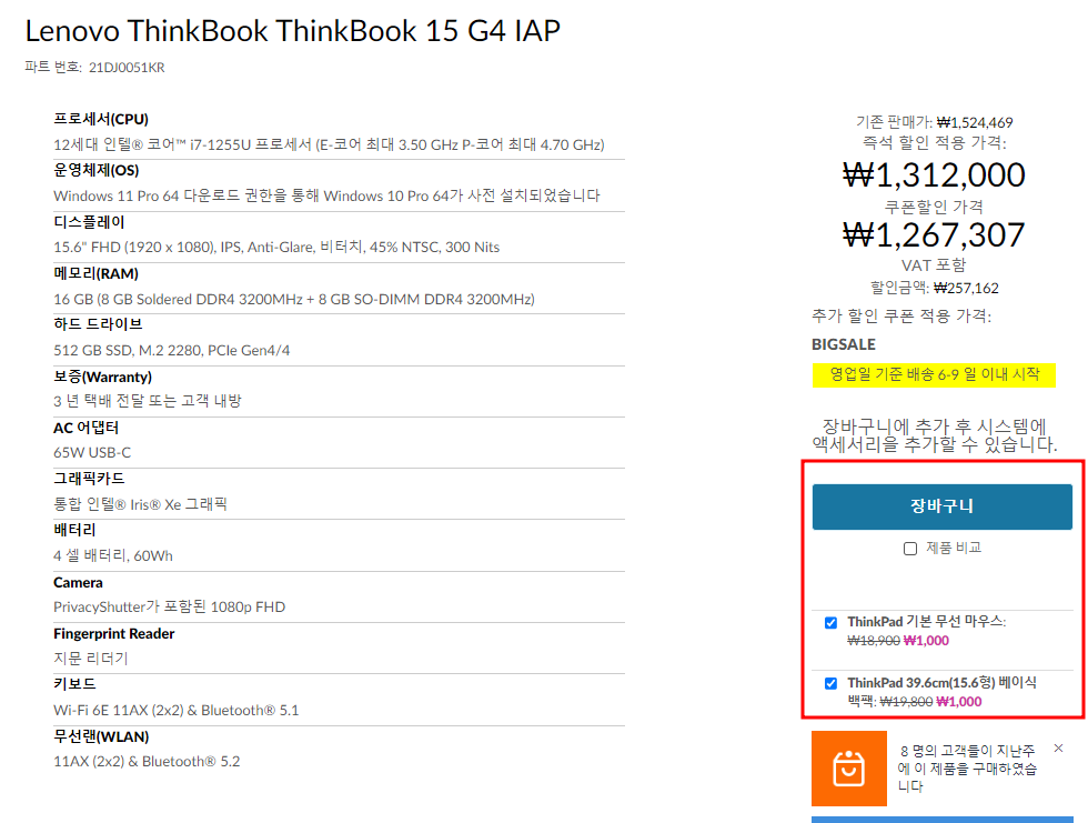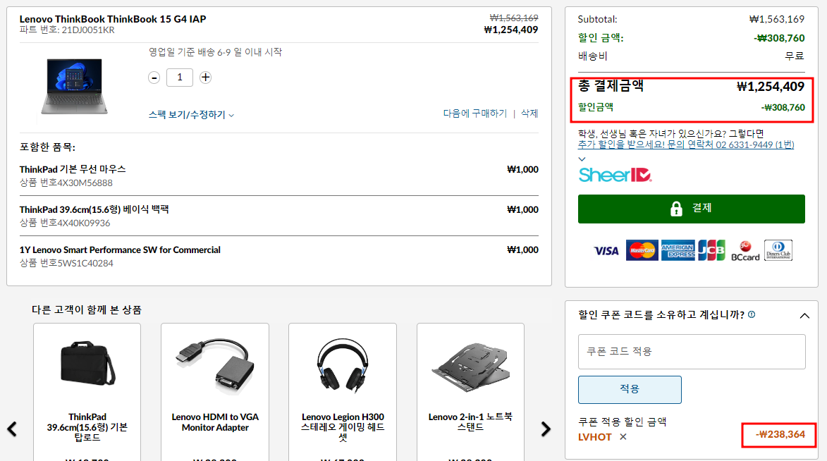 그럼 레노버 자체 할인코드보다 더 많은 할인이 된 것을