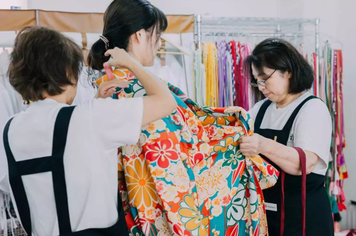 다양한 종류(여성 100벌, 남성 50벌) 중에서 마음에 드는 고급 기모노를 선택하세요.