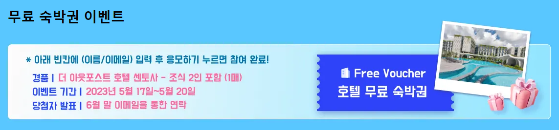 - 호텔 무료 숙박권 제공 이벤트 (싱가포르 더 아웃포스트 호텔 센토사 - 조식 2인 포함)