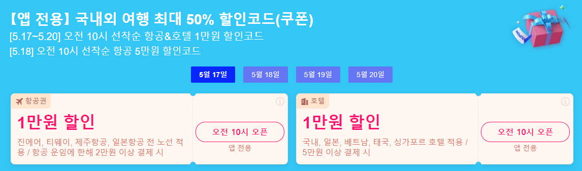 5월17일부터 20일까지 항공&호텔 1만원 할인코드