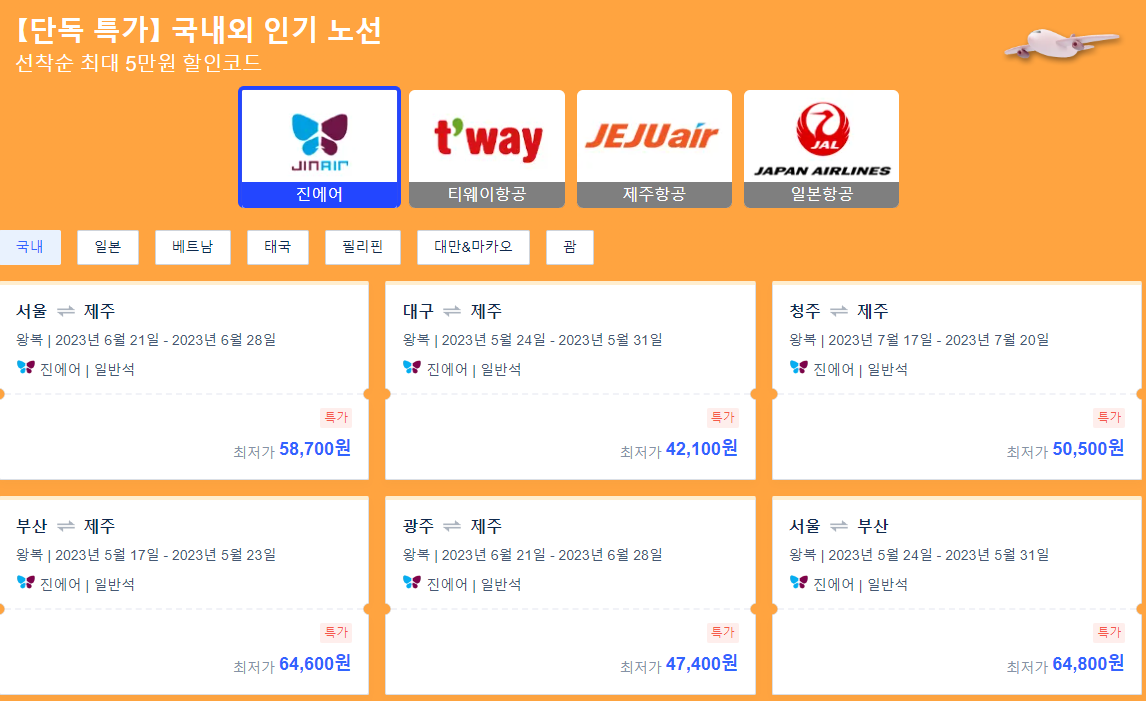 - 국내&일본&동남아(태국/베트남/싱가포르) 항공 단독 특가
