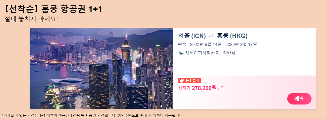 추가로 홍콩 항공권도 1+1 행사가 진행중이니