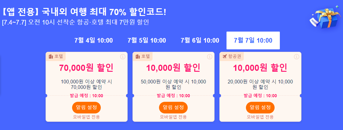 오전10시부터 선착순으로 항공 호텔을 최대 7만원