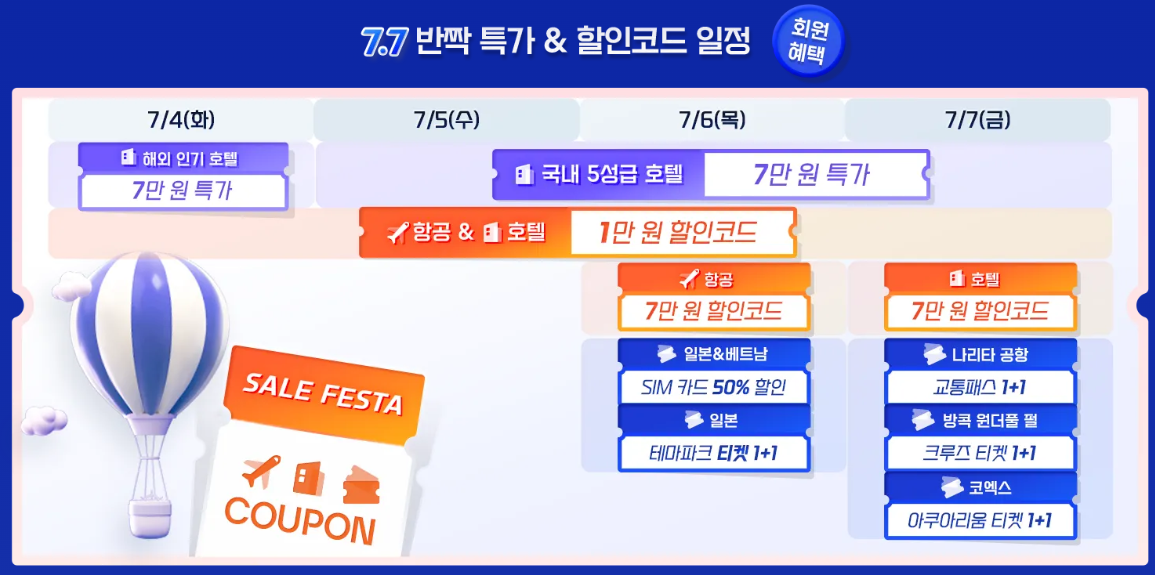 항공&호텔 7만 원 할인코드 외, 선착순 5성급 호텔 7만원 · 인기 테마파크 1+1 반짝특가!