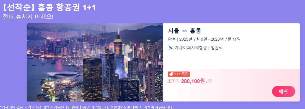 홍콩항공권을 1+1으로도 진행하고 있어요.