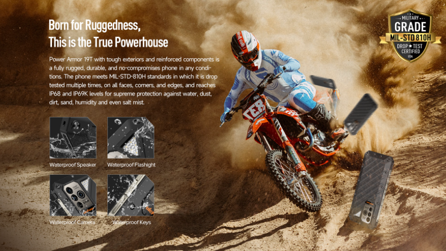 튼튼한 외장과 강화된 부품을 갖춘 파워 아머 19T 는 어떤 조건에서도 완벽하게 견고하고 내구성이 뛰어나며 타협 없는 전화기입니다. 전화기는 모든 얼굴, 모서리 및 가장자리에서 여러 번 드롭 테스트를 거치는 MIL-STD-810H 표준을 충족하며 물, 먼지, 먼지로부터 최상의 보호를 위해 IP68 및 IP69K 수준에 도달합니다. 모래, 습도 및 소금 안개.