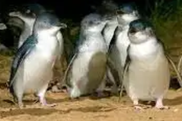 해질 무렵 작은 펭귄은 물에서 나와 모래사장을 가로질러 소그룹으로 뒤뚱뒤뚱 걷는다.
