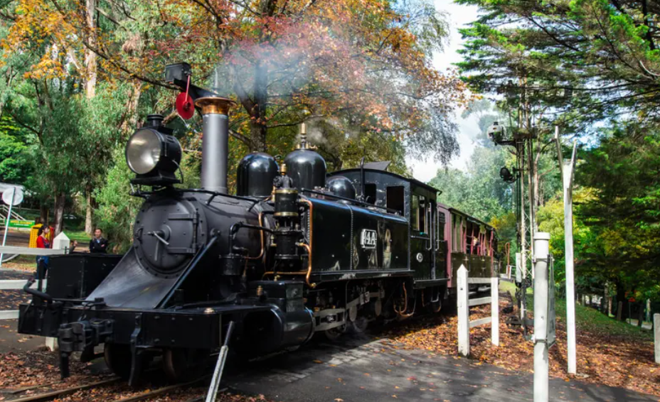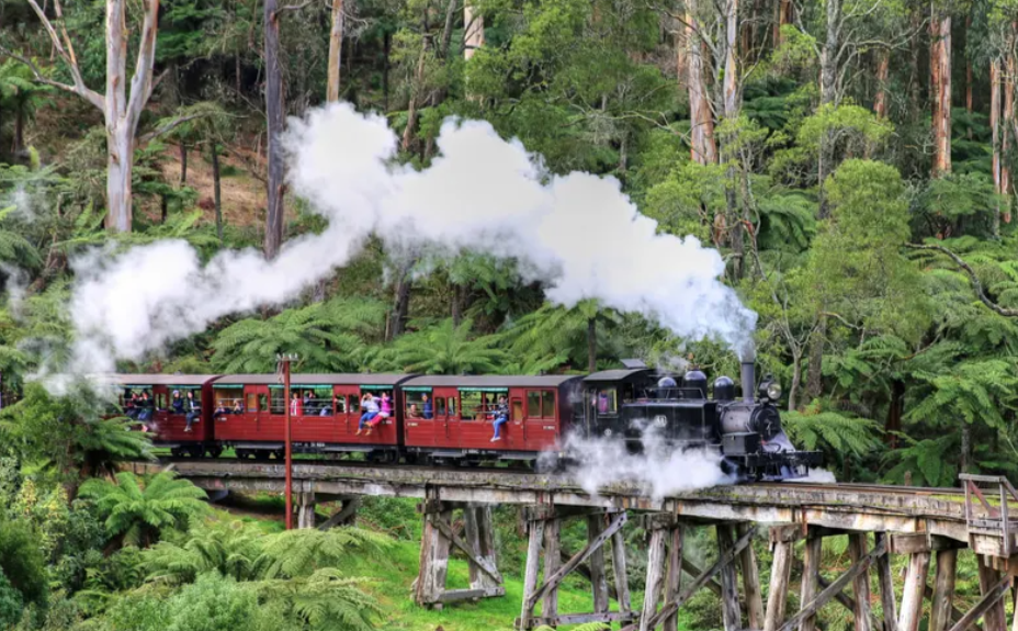 Puffing Billy 증기 기관차를 타고 에메랄드 호수 공원으로 가는 증기 기관차 경치 감상