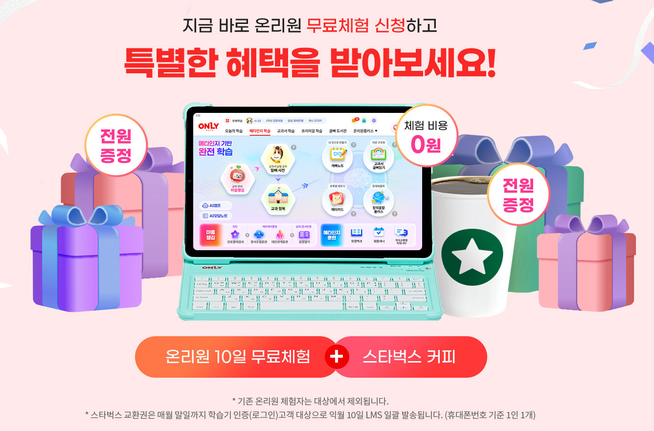 비상교육 온리원 무료체험하고, 메타인지 안내서와 스타벅스 커피를 무료로 받으세요.