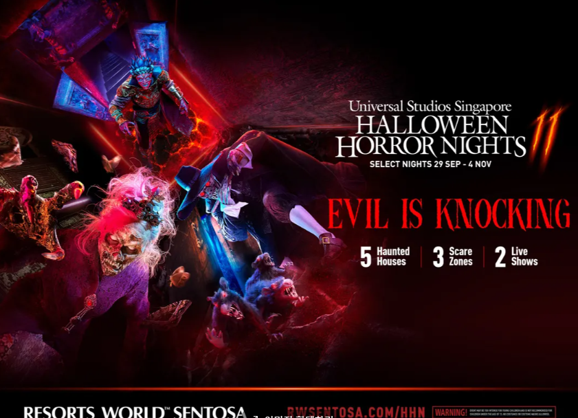 다시 찾아온 할로윈 호러 나이트 11! 기다리셨나요? 지금 만나보세요! 2023/9/29-11/4 동안 유니버셜 스튜디오 싱가포르 할로윈 호러 나이트 11에는 무서운 유령의 집 5곳, 공포존 3곳, 라이브 쇼 2회가 준비되어 있어요. 오감을 자극하는 식사도 즐겨보세요. 새로운 차원의 두려움을 느낄 수 있는 할로윈 이벤트를 즐겨보세요.