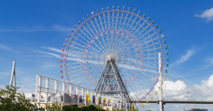 오사카항 유원지 '덴포잔 하버 빌리지'에 있는 직경 100m의 한 때 세계 최대의 대관람차인 덴포잔 대관람차. 오사카 시내와 유니버셜 스튜디오 재팬을 볼 수 있을 뿐만 아니라 날씨가 맑으면 동쪽으로는 이코마산맥, 서쪽으로는 아카시해협대교까지 바라볼 수 있어 15분간의 여유롭게 경치를 감상할 수 있습니다.