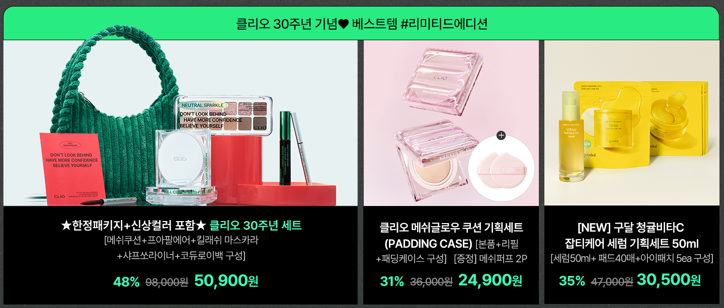 - 전 품목 최대 90% 할인! 한정 에디션 및 신상 포함 블프 한정특가 (+ 클리오 30주년 기념 리미티드 에디션)