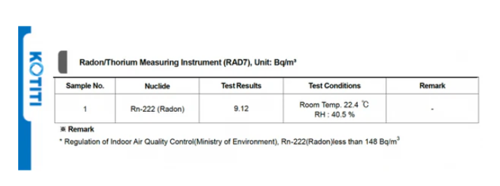 (환경부 권고 기준: 148 Bq/m3 vs 엠마 매트리스: 9.12 Bq/m3)