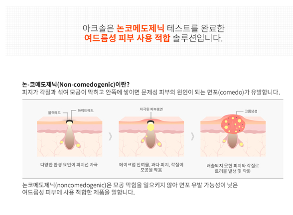 논코메도제닉 테스트를 완료한 아크솔은 여드름성 피부에 적합한 직중 케어 솔루션 입니다.