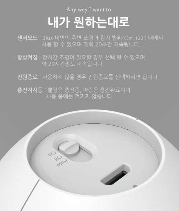 항상켜짐 : 장시간 조명이 필요한 경우 선택 할 수 있으며, 약 20시간 정도 지속됩니다.