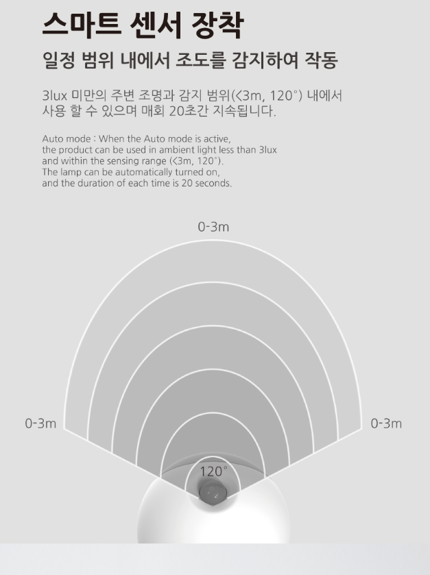 센서모드 : 3lux 미만의 주변 조명과 감지범위 내에서 사용 할 수 있으며 매회 20초간 지속 됩니다.