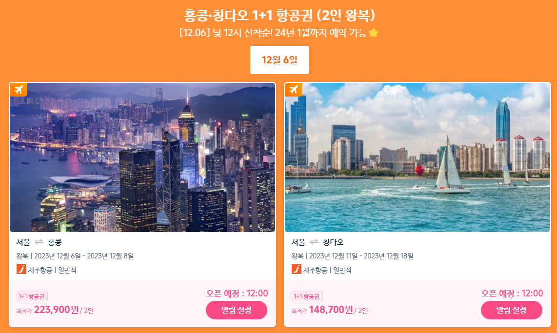 홍콩,칭다오 1+1항공권(2인왕복)