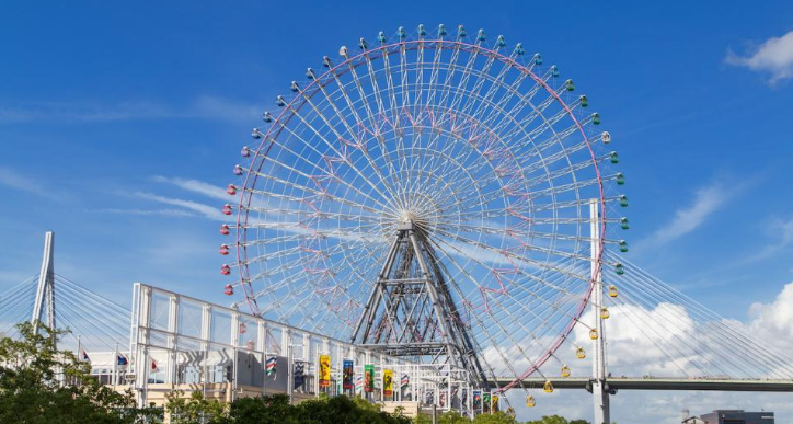 오사카항 유원지 '덴포잔 하버 빌리지'에 있는 직경 100m의 한 때 세계 최대의 대관람차인 덴포잔 대관람차. 오사카 시내와 유니버셜 스튜디오 재팬을 볼 수 있을 뿐만 아니라 날씨가 맑으면 동쪽으로는 이코마산맥, 서쪽으로는 아카시해협대교까지 바라볼 수 있어 15분간의 여유롭게 경치를 감상할 수 있습니다.