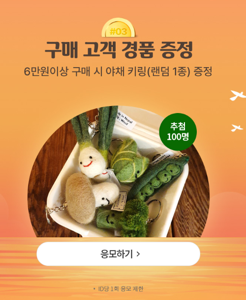 이벤트 응모 후 주문 취소(부분취소 포함)로 1회 결제 금액이 6만원 미만일 시 추첨 대상에서 제외됩니다.