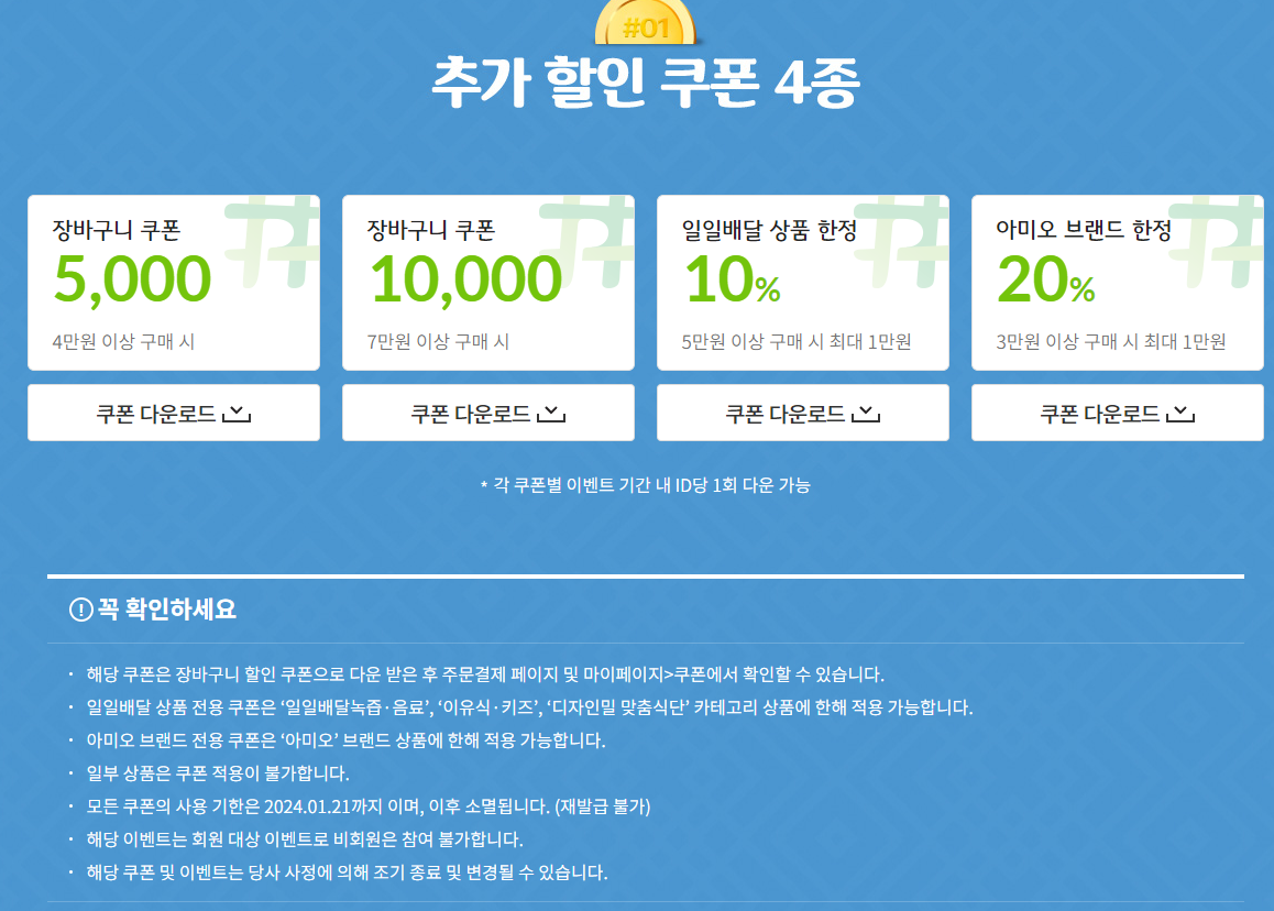 모든 쿠폰의 사용 기한은 2024.01.21까지 이며, 이후 소멸됩니다. (재발급 불가)