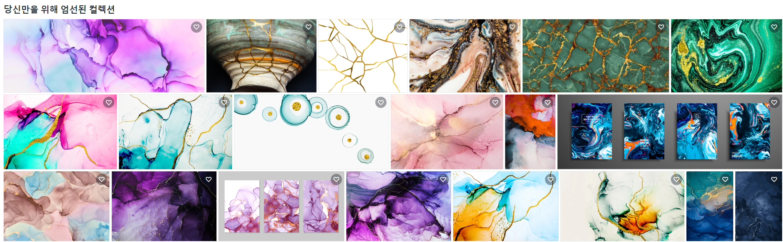 반투명한 색조의 흐름, 일렁이는 금속성의 소용돌이, 컬러 거품 스프레이 등이 이 컬렉션의 특징입니다. 자유롭게 흐르는 이 예술 작품은 완벽히 추상적이어서 주목을 받거나 다음 대형 프로젝트에서 눈길을 사로잡는 배경이 될 준비가 되어 있습니다.
