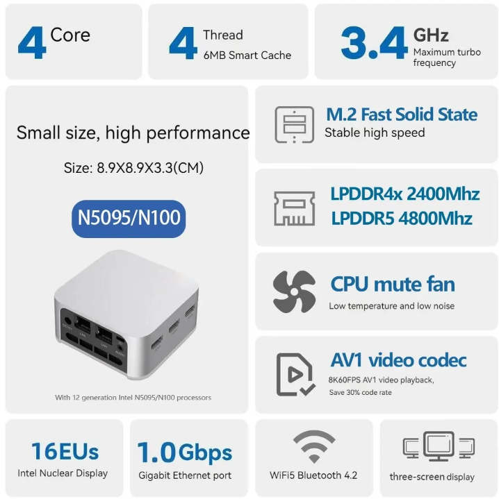 인텔 셀러론 N5095 프로세서: 미니 PC는 게임 요구에 빠르고 효율적인 성능을 제공하는 인텔 셀러론 N5095 프로세서를 갖추고 있습니다.