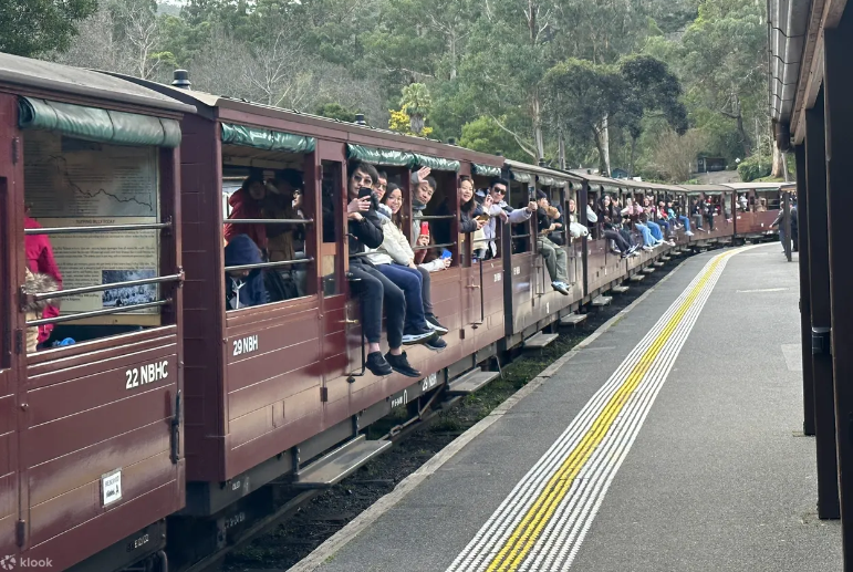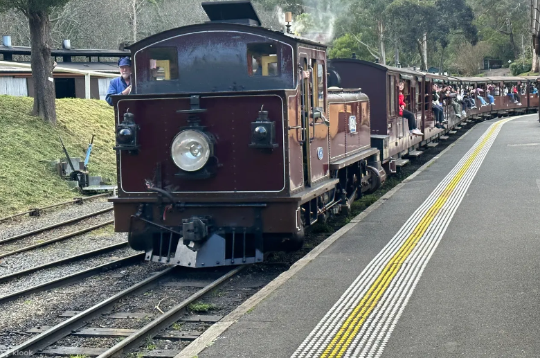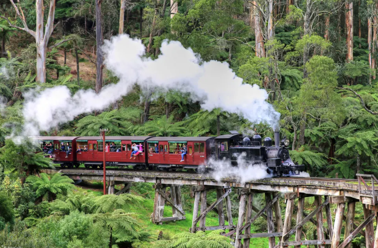 퍼핑 빌리(Puffing Billy) 증기 기관차를 타고 에메랄드 호수 공원까지 증기 기관차를 타고 경치를 감상하세요.