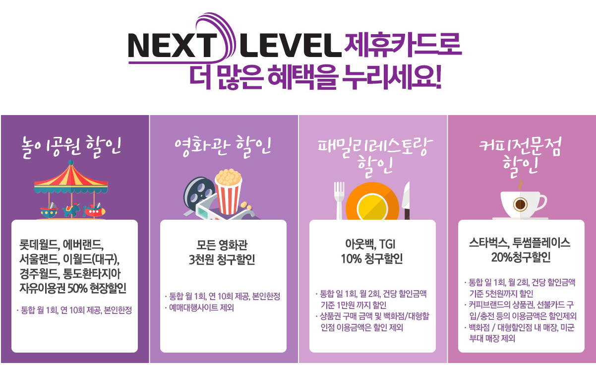 추가로 해주는 할인도 있는데요, 놀이공원 할인, 영화관 할인, 패밀리레스토랑 할인, 스타벅스,투썸플레이스 할인등 추가 혜택이 있어요.