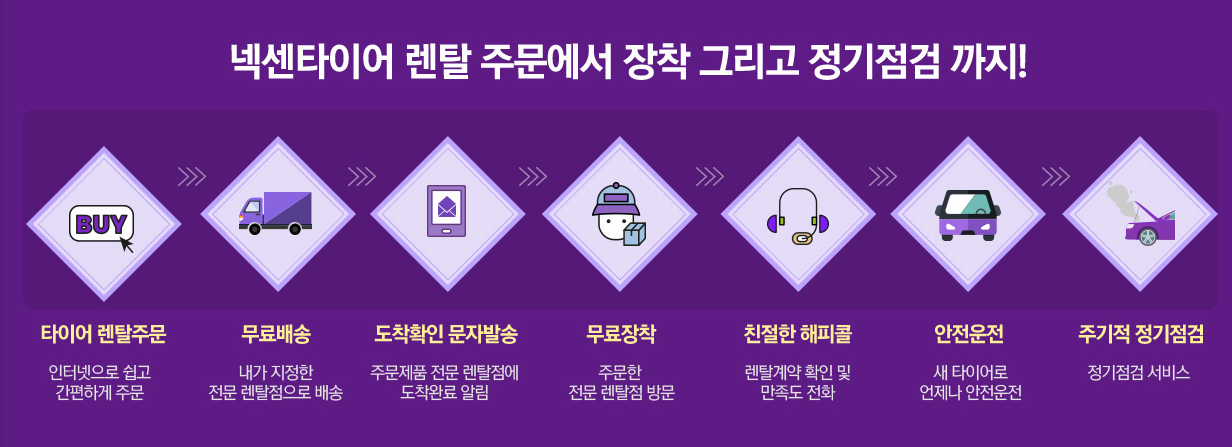 타이어 무상제공에 정기방문점검, 차량무상점검,위치교환서비스까지 해주고 있으니 자동차 타이어 교체 하실 때는 넥섹타이어 렌탈을 생각해보시는 것도 좋은 것 같아요.