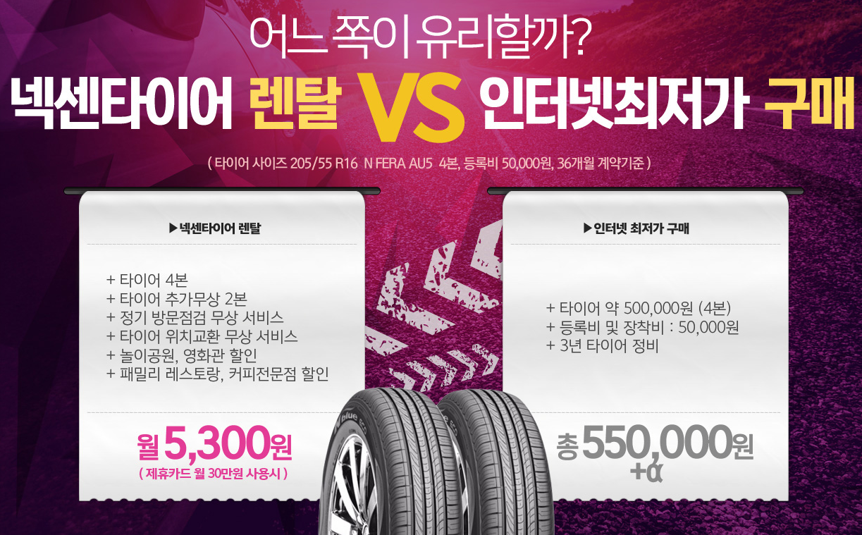 인터넷 최저가로 구매해서 장착비, 타이어 위치교환 등을 하면 비용이 추가가되지만 넥센타이어를 렌탈에서 사용하면 걱정하실 필요가 없어요.