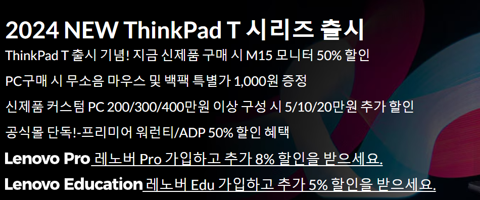 신제품 ThinkPad T 시리즈 구매 시 M15 모니터 50% 할인