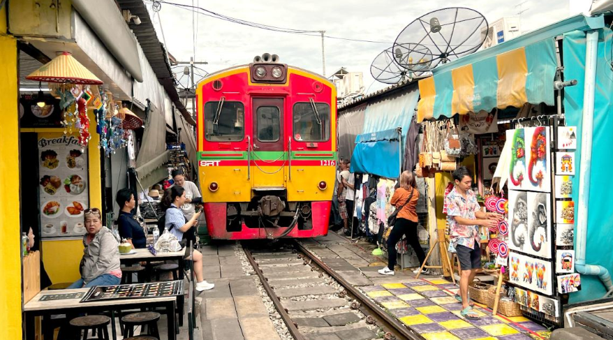 독특하고 활기 넘치는 광경인 매끌렁 철길 시장을 통과하는 기차의 통과를 감상해보세요.