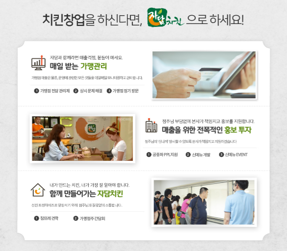 장사를 해보지 않은 분들은 어떻게 해야하는지 막막 할거에요. 하지만 자담치킨 본사에서 전폭적인 홍보를 해주고 있고, 가맹관리 까지 매일매일 모니터링하고 관리해주고 있어요.