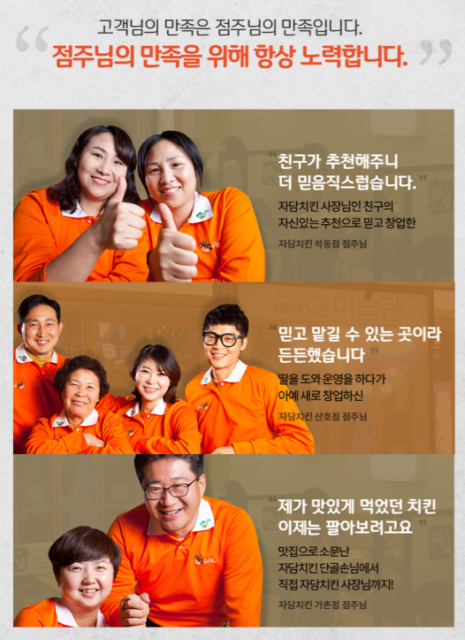 가맹점은 대부분 로열티 때문에 많이 힘들어 하지만 자담치킨은 로열티가 없으니 가맹점 리스크도 최소화 되었다고 보시면되요.