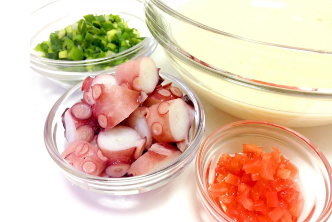 다코야키는 물과 계란을 섞어 만든 밀가루 반죽을 철판의 둥근 구멍에 붓고, 그 안에 다진 문어를 넣어 둥근 공 모양으로 굽는 요리입니다.