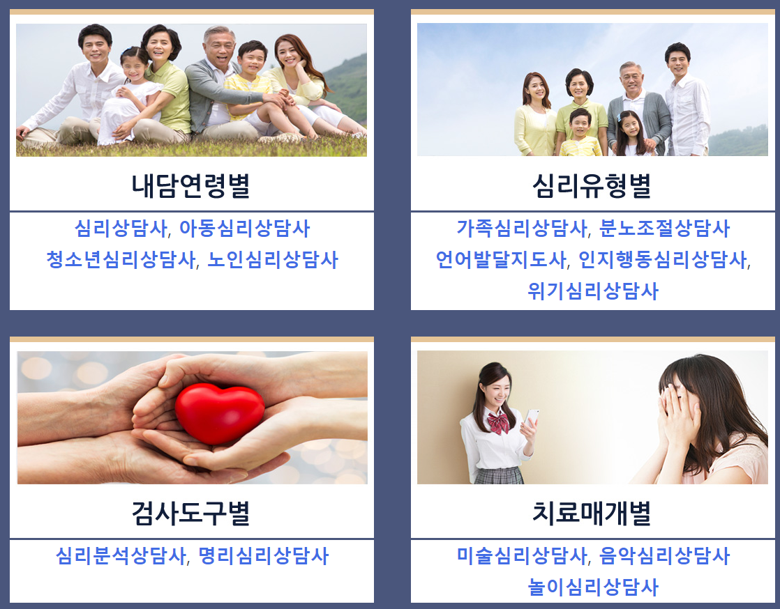 내담연령별, 심리유형별,검사도구별,치료매개별 등