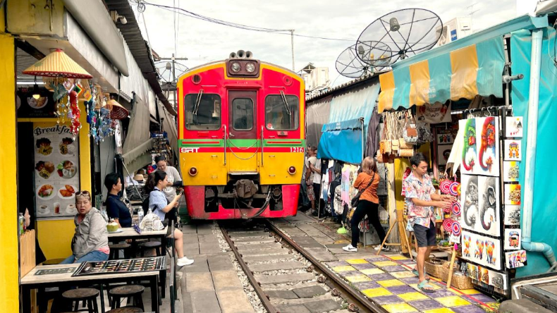 독특하고 활기 넘치는 광경인 매끌렁 철길 시장을 통과하는 기차의 통과를 감상해보세요.