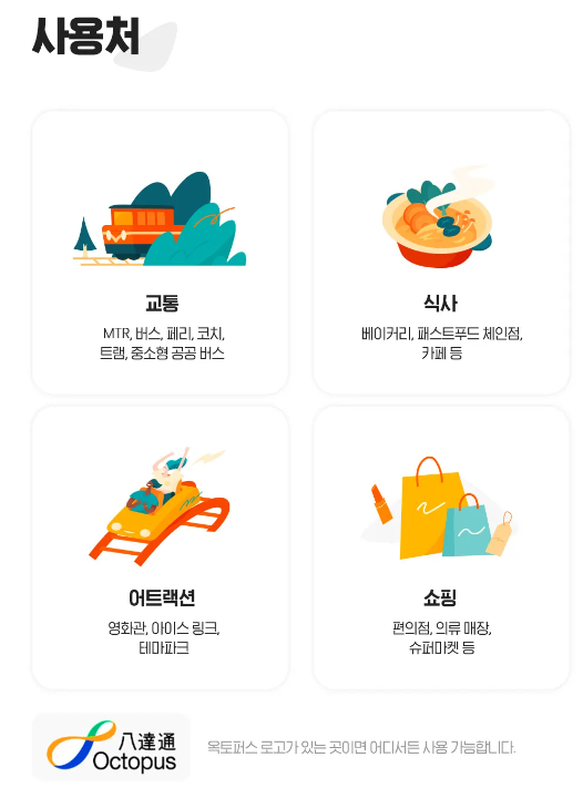 홍콩 여행 종합 선물 상자같은 투어리스트 옥토퍼스 카드! 교통수단 뿐만 아니라 편의점, 카페, 패스트푸드점, 슈퍼마켓, 주차장, 영화관, 자판기까지 홍콩 곳곳에서 현금처럼 사용할 수 있어요.