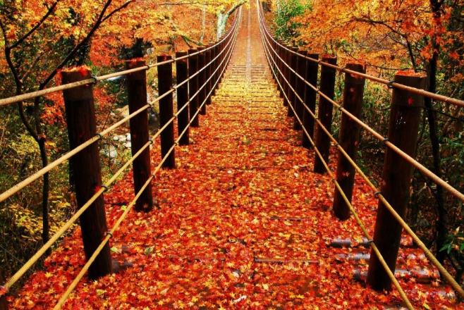 이바라키 최고의 단풍 명소는 하나즈키 계곡으로, 시오미 폭포 현수교에서는 화려한 단풍 터널을 바라볼 수 있습니다.